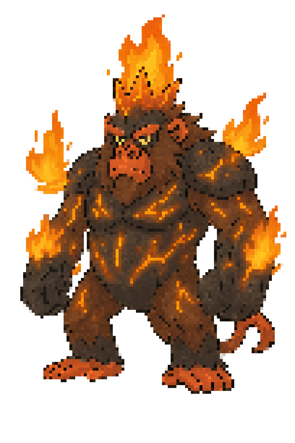 Pyrocongo reigns over volcanic peaks, standing tall with a magma crown pulsing from its head.