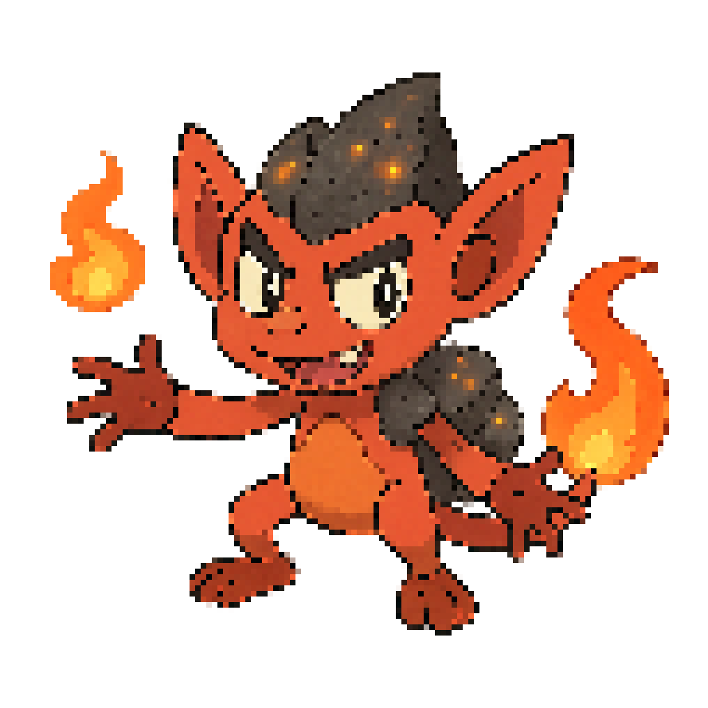 Cindimp is a mischievous fire monkey that lives near the bases of volcanoes, where it forages for glowing stones and coal.