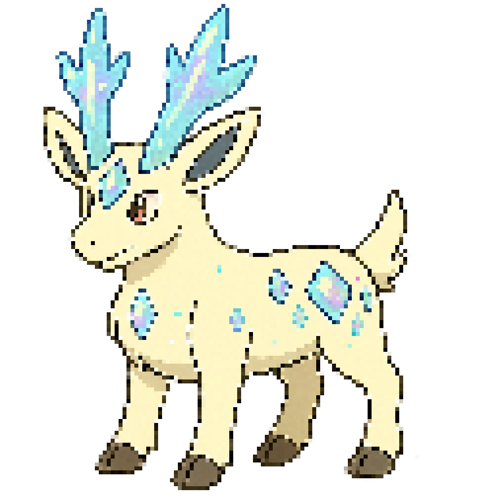 Fawnglow is a shy, rock-coated fawn Pokémon that hides among moonlit caverns and crystal groves.