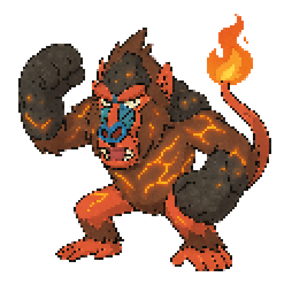 Pyrocongo reigns over volcanic peaks, standing tall with a magma crown pulsing from its head.